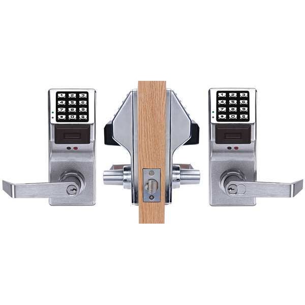 Electronic Keyless Lock, Function Entry with Key Override, Access Method Keypad, Mounting Style Cylindrical, Lock Material Zinc Alloy, Finish Satin Chrome, Series PDL5300, Handle Type Lever, Door Thickness 1-3/8 in to 1-7/8 in, Key Override Options Interchangeable Core, Hand Nonhanded, Outside Height 8 in, Outside Width 3 1/4 in, Keypad Material Metal, Power Source (5) AA Batteries, Battery Life 60,000 Cycles, Operating Temp. Range -31 Degrees to 151 Degrees F, Max. User Codes 2000