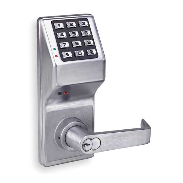 Electronic Keyless Lock, Function Office with Key Override, Access Method Keypad, Mounting Style Cylindrical, Lock Material Zinc Alloy, Finish Satin Chrome, Series DL2800, Handle Type Lever, Door Thickness 1-3/4 in, Key Override Options Standard Core/Interchangeable Core, Hand Nonhanded, Outside Height 8 in, Outside Width 3 1/4 in, Outside Depth 3 1/2 in, Keypad Material Metal, Power Source (5) AA Batteries, Battery Life 80,000 Cycles, Operating Temp. Range -31 Degrees to 151 Degrees F