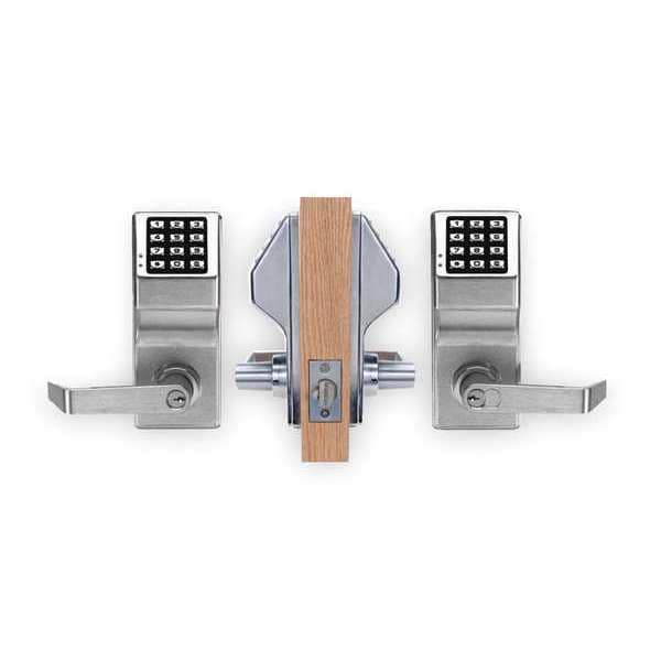 Electronic Keyless Lock, Function Entry and Egress with Key Override, Access Method Keypad, Mounting Style Cylindrical, Lock Material Zinc Alloy, Finish Satin Chrome, Series DL5200, Handle Type Lever, Door Thickness 1-3/4 in, Key Override Options Standard SC1 Keyway, Hand Nonhanded, Outside Height 8 in, Outside Width 3 1/4 in, Outside Depth 3 1/2 in, Keypad Material Metal, Power Source (5) AA Batteries, Battery Life 80,000 Cycles, Operating Temp. Range -31 Degrees to 151 Degrees F