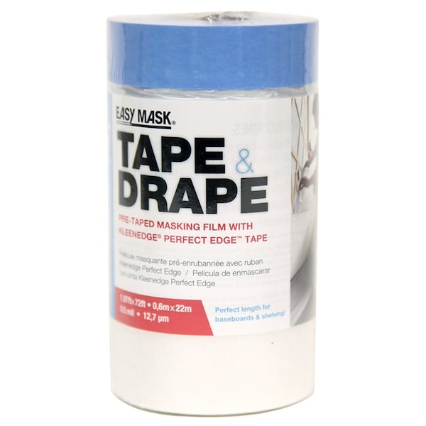 Trimaco's Easy Mask Tape & Drape Pre-taped Masking Film with KleenEdge Perfect Edge Tape is perfect protection for use in areas where you want to catch drips and overspray! Medium tack tape is applied along one edge of high-density 0.5 mil masking film. This masking film has a unique coating which helps create cling to the surface protected - even in windy conditions or with spray applicators. Great for painting trim and protecting shelving during the painting process. Surface protector works alone or with Easy Mask's QM5000 PRO Masker.
