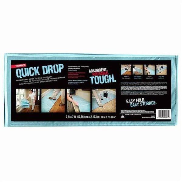 Trimaco's Quick Drop is an easy to use folding mat design. Easy to handle and maneuver; simply drop, kick into place and start painting. Made of a revolutionary fabric with a specially engineered coating, Quick Drop is absorbent and impenetrable to paints, stains, solvents and more. Perfect for touch ups, punch lists and smaller projects, this durable drop cloth fits in hard to reach spaces and works great on counter tops, carpet, hardwoods, vinyl and tile floors. Use time and time again simply folding in between jobs for easy storage.
