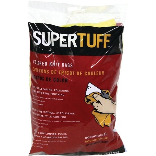 Trimaco SuperTuff pre-cut rag colored t-shirt knit rags. Absorbent and colorfast. Use throughout the home, office, marine and industry. Reusable and machine washable. Use for staining, polishing, cleaning and faux finishing.