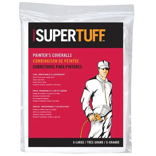 Trimaco's SuperTuff Polypropylene Disposable Coveralls are made from a special non-woven polypropylene fabric that protects skin and clothing from paint, grease, overspray and dirt. These painter's coveralls are tough, durable, lightweight, tear-resistant, washable and reusable! Protective wear features a zippered front and elastic back and wrists. Legs can be cut to fit any height. Available in Medium, Large, X-Large and XX-Large