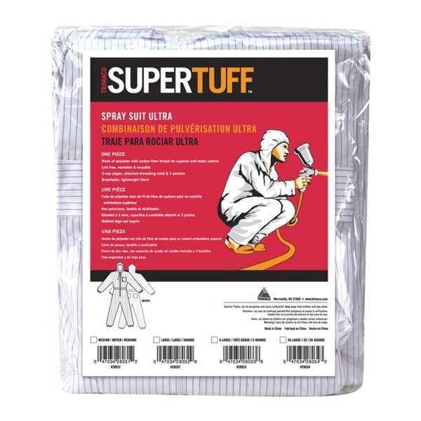 Spray Suit, Material 0.5 Percent Carbon Fiber, 99.5 Percent Polyester, Front Closure Type Zipper, Fabric Weight 3.5 oz, Color White, Maximum Waist Size 40 in-42 in, Inseam 34 in, Size 2XL, Features Carbon Fiber Striped, Reusable, Lint Free