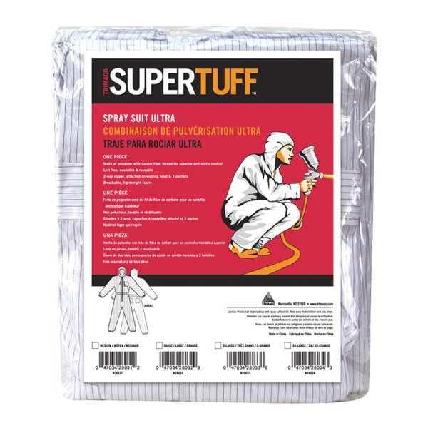 Spray Suit, Material 0.5 Percent Carbon Fiber, 99.5 Percent Polyester, Front Closure Type Zipper, Fabric Weight 3.5 oz, Color White, Maximum Waist Size 38 in-40 in, Inseam 34 in, Size XL, Features Carbon Fiber Striped, Reusable, Lint Free