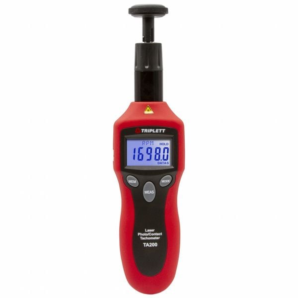 Combination Tachometer, RPM Accuracy +/-0.05 Percent of Reading +1 Digit, RPM Resolution 0.1 RPM, Maximum Contact RPM 20,000 RPM, Minimum Contact RPM 2 RPM, Maximum Non-Contact RPM 200,000 RPM, Minimum Non-Contact RPM 2 RPM, Maximum Non-Contact Distance 19 3/4 in, Minimum Non-Contact Distance 1 in, Calibration Certificate Type Available Separately, Maximum Velocity Measured Not Applicable, Minimum Velocity Measured Not Applicable, Includes (2) Contact Tips, 23 in Reflective Tape, Carrying Case
