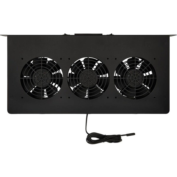 Equipment Rack Air-Distribution Fan, 1 5/8 in Height, 18 7/8 in Width, 8 7/16 in Depth, 475 cfm CFM @ 0.000-In. SP, Voltage 120V AC, 192 Watts, Sound Level 65 dB, 60 Hz Hz, Bearing Type Ball, 1.6 A Amps, 3,000 RPM RPM, For Use With Standard Racks, Mounting Location Rack, Mounting Position Horizontal, Motor Design 3-Phase, Max. Ambient Temp. 302 Degrees F, Blade Material Polycarbonate, Housing Material Steel, Black, Includes Temperature Sensor, Standards EIA/ECA-310-E, RoHS Compliant