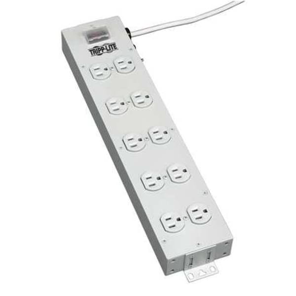 Power Distribution Unit, Built-In Circuit Breaker Yes, Color Gray, Cord Length 15 ft, Number of Outlets 10, Receptacle Type NEMA 5-15R, Maximum Input Voltage 120V AC, Outlet Surge Protection No, Metered Non-Metered, Rack Units Not Applicable, Mounting Location Floor, Wall, Plug Type NEMA 5-15P, Distance Between Front Outlets 2 3/4 in, Features Multi-Outlet Power Strip, Housing Material Metal, Includes Mounting Brackets, Maximum Current 15 A, Overall Height 17 1/2 in, Overall Length 2 1/4 in