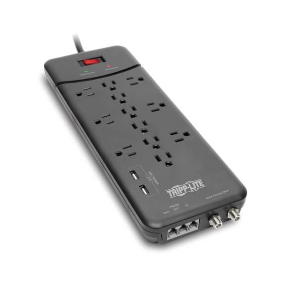 Power Strip, Surge, Coax, USB, 5-15R, 5-15P, 8 ft., Black