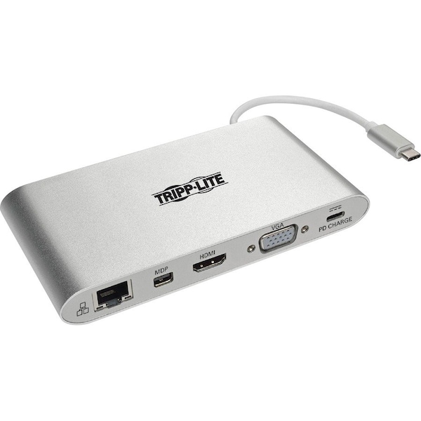 USB 3.1, generation 1 USB-C Docking Station turns your MacBook, Chromebook, tablet or laptop into a versatile workstation. By connecting its built-in cable to your device's USB-C or Thunderbolt 3 port, you'll be able to add an external display, access Gigabit Ethernet networks, transfer data, display video and more. Mini DisplayPort (mDP), VGA and HDMI ports allow you to connect an external display (one display at a time). The mDP and HDMI ports support UHD video resolutions up to 3840 x 2160 (4K x 2K) at 30 Hz. The VGA port supports HD video resolutions up to 1920 x 1200, including 1080p, at 60 Hz. Connect a Gigabit Ethernet cable (sold separately) to the RJ45 port to access true 10/100/1000 Mbps network speeds. A dedicated BC 1.2-compliant USB port provides up to 1.5A of fast-charging power. Micro SD and SD/MMC memory card slots provide access to external memory. A 3.5 mm audio jack is convenient for connecting speakers, headphones or a microphone to your connected device.