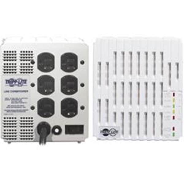 Maintains usable 120V nominal output during brownouts as low as 87V and overvoltages as high as 140V. 1800 watts output power rating supports heavy 120V loads up to 15 amps. Network grade surge suppression. Complete EMI/RFI noise filtering. 7 diagnostic LEDs indicate input voltage levels surge suppression status and line fault conditions. 6 protected NEMA5-15R outlets. 6-ft. AC power cord with standard NEMA5-15P input plug.