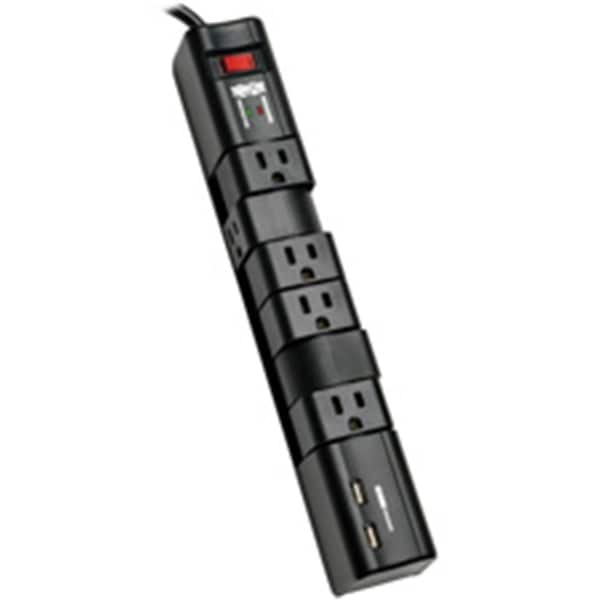 The TLP608RUSBB surge suppressor offers reliable surge and line noise protection.Premium features include 6 rotatable outlets 8 foot cord in attractive black housing.The unique rotating design provides convenience and flexibility.Each outlet rotates independently to provide the perfect position to connect your equipment.The TLP608RUSBB also includes 2 USB ports with 3.4 amps of total power that offers fast charging for smartphones tablets MP3 players and other portable devices.1080 joules of surge protection to handle the strongest surge.Diagnostic LED alerts you to potential wiring or protection faults before connected equipment is damaged.$50 000 Ultimate Lifetime Insurance U.S.Canada and Puerto Rico only.Features -Protect It Surge Protector with 6 Rotatable Outlets 8 ft.Cord 2xUSB Charging Ports -6 rotatable outlets -8 ft.cord -Surge suppression rating: 1080 joules -3.4 amp USB Charger -EMI/RFI noise filtering -Diagnostic LED indicates Protected green -$50 000 Ultimate Lifetime Insurance U.S.Canada and Puerto Rico only -Automatic shutoff cuts power to outlets when the protection circuit has been compromised Specifications - Charging Ports / Amps: 2 3.4A - Frequency Compatibility: 60 Hz - Output Receptacles: 6 5-15R - Output Watts: 1800 - Circuit Breaker amps: 15 - Right-Angle Outlets: No - Nominal Input Voltages Supported: 120V AC - Recommended Electrical Service: 120V - Input Connection Type: NEMA 5-15P input plug - Input Plug Features: 120V 15A - Input Cord Length ft.: 8 - Input Cord Length m: 2.44 - Input Cord Length Details: 8 ft cord - Voltage Compatibility VAC: 120 - Right-Angle Plug: No - AC Suppression Joule Rating: 1080 - Protection Modes: Includes full normal mode H-N and common mode N-G / H-G line suppression - Clamping Voltage RMS: 500 - UL1449 Let Through Rating: 500 400 500 - Immunity: Conforms to IEE 587/ANSI C62.41 - Telephone/DSL Protection: No - Cable Coax Protection: No - Network Ethernet Protection: No - Unit Dimension hwd / in.: 12.93 x 2.02 x 2.07 - Unit Dimension hwd / cm: 32.84 x 5.13 x 5.26 - Unit Weight lbs.: 1.42 - Unit Weight kg: 0