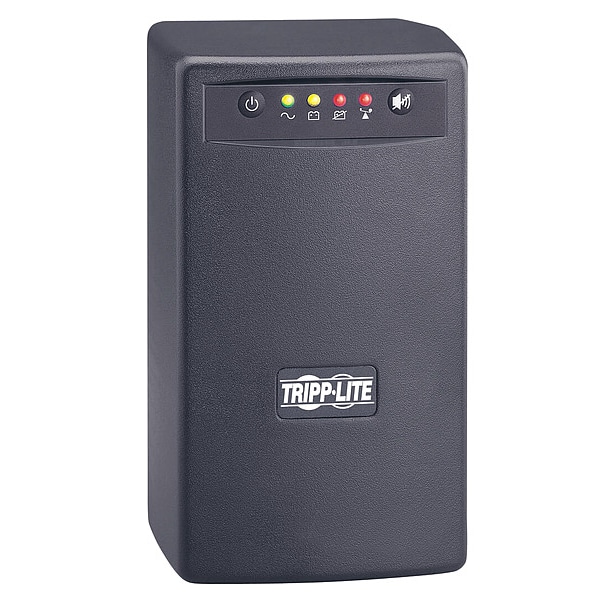 OMNISMART500 line interactive UPS system offers voltage regulation and battery support, plus complete AC and dialup/DSL line surge suppression, Supports entry level PC systems for up to 30 minutes during power failures to enable a safe system shutdown, Supports a maximum load of 500VA/300 watts for 5 minutes and a half load of 250VA/150 watts for 17 minutes, Automatic Voltage Regulation (AVR) circuits correct brownouts as low as 75 volts and overvoltages as high as 147 back to normal 120 volt levels without using battery power, Attractive gray tower configuration, Includes 3 battery supported outlets, plus 3 additional surge suppression-only outlets, 6 foot AC line cord (all NEMA 5-15), Built-in USB port supports PowerAlert UPS Power Management Software (available via free download at tripplite.com) and cabling provides monitoring of in-depth site power conditions, full UPS status and fault warnings, output load level and load bank power control, Supports Tripp Lite's WatchDog Service Monitoring/Rebooting Software (part# WATCHDOGSW), Built-in dataline suppression jacks protect a single dialup phone / DSL line, Built-in audible alarm and 4 front panel LEDs indicate UPS system and line power status, 500VA / 300 watt power handling ability supports a variety of computer, internetworking, telecom and consumer electronics equipment, Supports battery replacement via built-in access panel, Compatible with 120V / 60Hz applications for USA, Canada, Mexico and more, 2 year manufacturer's warranty, $200,000 connected equipment insurance (USA & Canada only)