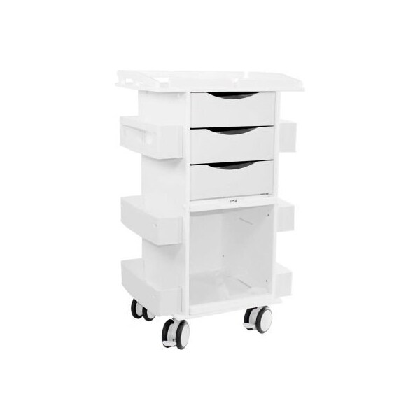 Trippnt's core dx cart with white drawers, sliding door, and railtop organizes, stores, and secures supplies. It offers a 1-inch railtop for securesd top storage, 3 drawers, 4 shelves, 2 dispensing shelves, and bulk storage with a sliding clear door. It's built-in handles are ergonomic and easy to grab and the sliding door offers a smaller usage footprint. It is constructed from a corrosion-resistant non-metal rust proof polymer with robust 4-inch twin wheel casters capable of easily navigating elevator gaps and uneven surfaces. Available in 13 color variants. Ships fully assembled. features: 1 inch rail top, 2 locking & 2 swivel 4in twin wheel casters,, 3 total locking drawers, 6 side shelves, locking bulk storage with sliding drawer built-in easy to grab handles corrosion-resistant, non-metal hdpe construction organizes, stores, and secures supplies 100% total replacement lifetime guarantee/ formerly trippnt item no. 50924