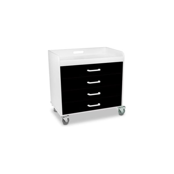 Trippnt's extra wide compact cart with black drawers offers under counter storage to organize and secures supplies. It has 4 full-extension total locking drawers with 3 inch polypropylene casters, 2 locking, 2 swivel, and a built-in tray top. There is a built-in push-pull handle for easy mobility. Available in 13 color variants. Ships fully assembled. features: 2 locking casters, 2 swivel casters, and 4 total locking drawers built-in recessed tray in the top of the cart corrosion-resistant, non-metal hdpe construction designed to be space saving while offering substantial storage 100% total replacement lifetime guarantee/ formerly trippnt item no. 51417
