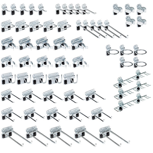 Pegboard Hook Assortment Kit, Number of Hooks 63, 1 1/2 in For Pegboard Hole Spacing, For Pegboard Hole Size 3/8 in, For Tool Type Multiple, Screw-In, ABS Retainers Locking System, Square For Pegboard Hole Shape, Steel, Silver, Zinc-Plated, Hook Assortment Kit Accessory Type
