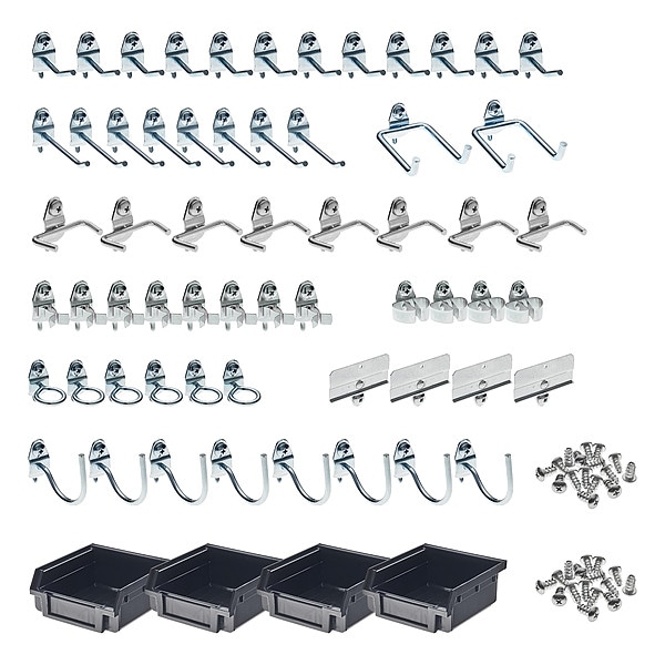 Hooks and Hanging Bins, Number of Bins 4, Number of Hooks 60, Number of Rings 6, Overall Height 5 1/8 in, Overall Length 8 in, Overall Width 6 1/4 in, 1 in Hook Depth, 1 in For Pegboard Hole Spacing, For Pegboard Hole Size 1/8 in, 1/4 in, For Tool Type Multiple, Surface, Screw-In Locking System, Round For Pegboard Hole Shape, Steel, Black, Silver, Zinc-Plated, Hook and Bin Assortment Kit Accessory Type