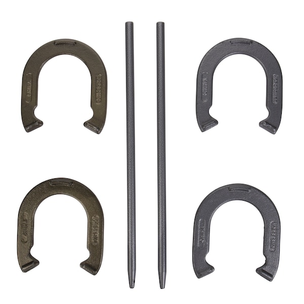 - •Horseshoes set includes two 20" stakes with silver hammer finish