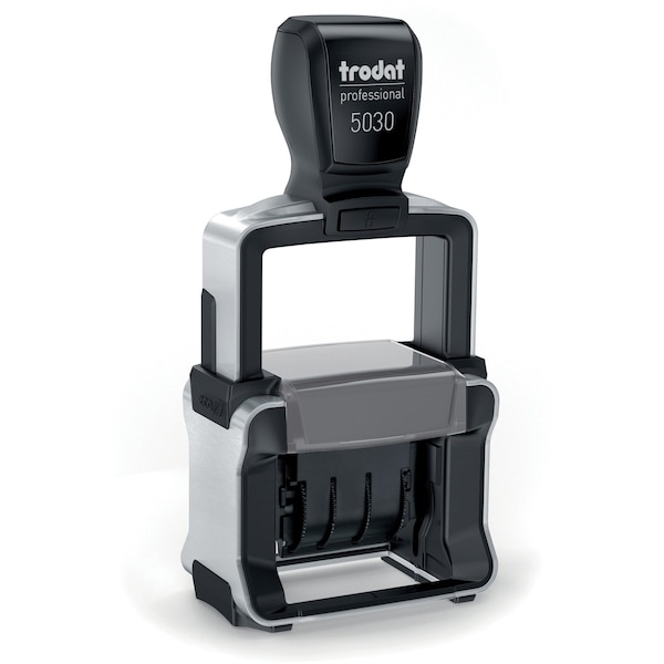 is designed for busy offices that need a quick, easy way to stamp documents with the date. Sturdy steel frame construction withstands heavy use. Self-inking dater delivers rapid, repeat impressions of the date. Impression size is 1-5/8" x 3/8". Date band cover keeps fingers clean. Four-band date includes months, days and 10 years. Stamp delivers up to 10,000 impressions.