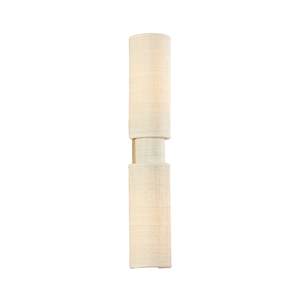 The beauty of the Ashton sconce stems from its simplified form and distinctive materiality. Woven from Saguran fabric, three cylindrical shades overlap to form areas that emit more or less light. This highly textural 2-light sconce is perfect for a bathroom or other small space as it creates a serene ambience.*Due to the one-of-a-kind nature of the medium, exact colors and patterns may vary slightly from the image shown.