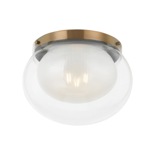 Paying tribute to the '70s, Magma features a layered glass silhouette with serene finish combinations. With clear glass on the exterior and mist glass within, this three-light flush mount benefits from an ethereal halo effect. Mounted on a Patina Brass base, it brings an artistic touch to the everyday.