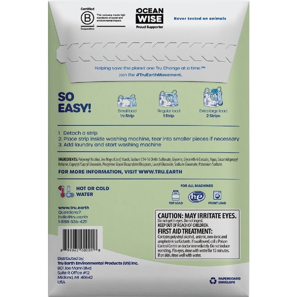 Each Tru Earth eco-strip packs an ultra-concentrated hypoallergenic eco-friendly cleaning power into a tiny pre-measured strip of detergent that you just toss in the wash. New zero-waste compostable packaging. No measuring & no mess. Dissolves completely in Hot or Cold Water. Works in all washing machines including HE. Front loads or top loads. Helps keep 700000000 plastic jugs out of landfills per year. Tru Earth Certifications. Paraben-free and Phosphate-free. Readily biodegradable in accordance with OECD 301D. Hypoallergenic certified by independent dermatologists. Vegan: no animal-based ingredients or testing on animals by us.