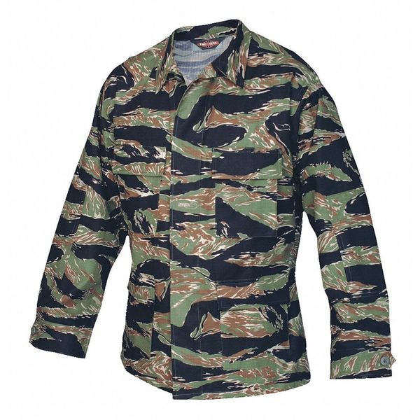 BDU Coat, Size 2XL, Color Vietnam Tiger Stripe, Material 100 Percent Cotton Ripstop, Fits Chest Size 50 In. to 52 In., Length 32 In., Sleeve Length 25-1/2 In., Garment Style Jacket, Fabric Weight 6.5 oz., Binding Melamine Buttons, Pockets 4, Type Regular