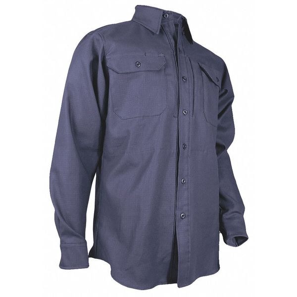 ATPV Rating 8.9 cal/sq cm, Arc Flash PPE Category 2, Collar Style Button-Down, Color Navy, Fabric Weight 7.5 oz, Features Bi-Swing Maximize Comfort, Closure Type Buttons, Gender Men's, Flame-Resistant Dress Shirt, Material Trade Name Cotton, Maximum Chest Size 44 in, Minimum Chest Size 42 in, Neck Style Collar, Number of Pockets 2, Pocket Location Chest, Size L, Sleeve Length 36 in, Sleeve Length Type Long