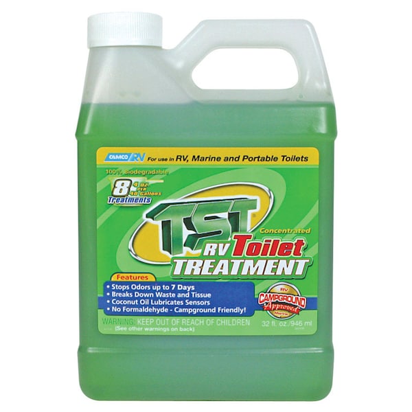 TST Concentrated RV Toilet Treatment breaks down waste and tissue to stop odors up to 7 days. 4 ounces treats a 40 gallon holding tank. Lubricates and cleans sensors. No harmful formaldehyde.