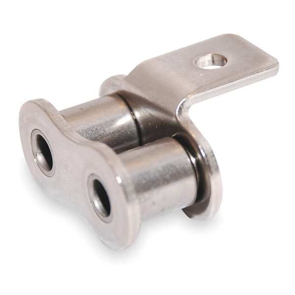 Roller Attachment Link, Attachment Number A-1, Attachment Type Tab, Material Stainless Steel, Chain Overall Width 1.087 in, Chain Number 60, Roller Diameter 15/32 in, Finish Plain, Pitch 3/4 in, Link Type Roller Attachment, Centerline to Attachment End 0.581 in, Centerline to Hole Center 0.506 in, Extended Pin Diameter 0.234 in, Lubrication SAE 10 to SAE 50, Material Grade 600, Maximum Operating Temperature 750 Degrees F, Minimum Operating Temperature -40 Degrees F, Number of Tab Holes 1