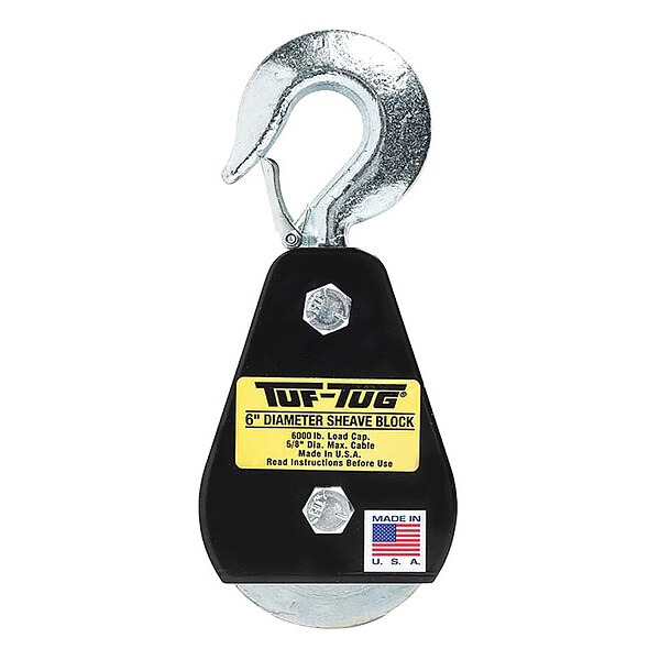 Pulley Block, Product Type Sheave Blocks, Working Load Limit 6,000 lb, Attachment Type Swivel Hook, Compatible Rope Diameter 3/4 in, Sheave Outside Diameter 6 in, Compatible Rope Type Wire Rope, Bearing Type Brass, Attachment Inside Diameter 1 7/8 in, Housing Material Steel, Mounting Hole Diameter 1 1/2 in, Sheave Material Steel, Overall Width 6 1/2 in, Overall Depth 1 1/2 in, Finish Powder Coated, Standards ASME B30