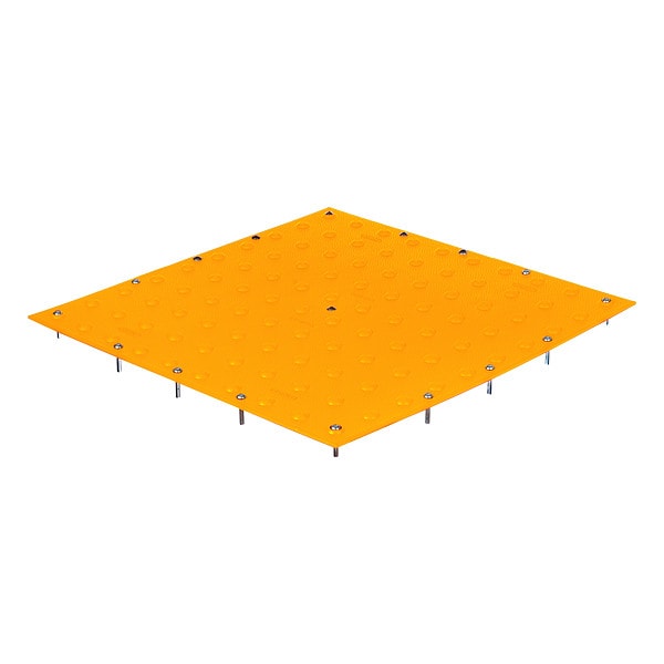 Detectable Warning Tile, ADA Compliant Yes, Installation Method Surface Applied, Wet Set, Installation Surface Concrete, Material Polymer, Length 24 in, Width 60 in, Thickness 3/16 in, Color Yellow, Weight 13 lb, Surface Installation Method Fastener, Includes Assembly Hardware, Includes Installation Hardware Yes, Dome Spacing 2.35 in, Replaceable Yes, Standards ADAAG, Surface Design In-Line Truncated Domes
