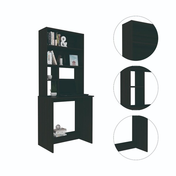 The Compu Hutch Desk is the perfect option for anyone looking for a space-saving and versatile desk. This slim hutch desk stands 71 in. tall and provides plenty of storage and organizational options. Perfect for a home office or any other space-challenged area, this desk is sleek, sturdy, and stylish.With multiple open shelves, ample table for the computer 29,6 in. W X 19,1 in. D X 71,1 in. HProduct size 29,6 in. W X 19,1 in. D X 71,1 in. H fits perfect in any room.Designed with a unique black particleboard finish.