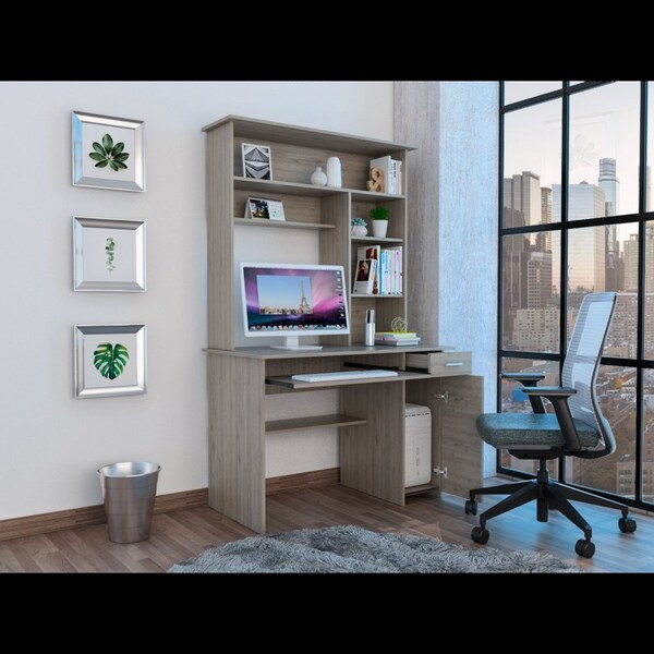 The Compu 180 Hutch Desk is perfect for the modern professional. This sturdy desk provides multi-level storage and organizational options, making it easy to keep your work area tidy. The CPU tower storage neatly tucked below with an access area behind gives you plenty of room to store your equipment. A retractable keyboard tray folds away below the desktop to create less clutter and protect your keyboard. And with multiple shelves for storage and decor, this desk is very versatile. So if you're looking for a sleek and functional desk that will help you stay organized and productive, the Compu 180 Hutch Desk is worth considering.Ideal size 43.3 in. W X 22.9 in. D X 0.8 in. HMade of Light Gray particleboard finish.