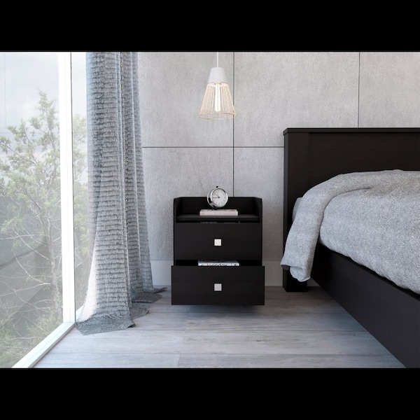 The AURA NIGHTSTAND is the perfect bedside station to keep any of your bedside essentials. It boasts two perfectly sized drawers 18,8 in. H X 37,7 in. W and a top-shelf style area 10,1 in. H X 43,3 in. W to quickly grab any of your day-to-day belongings. This stylish piece will add some flair to any bedroom!Product size 18,22 in. W X 15,74 in. D X 21,88 in. H made of black particleboard finish.