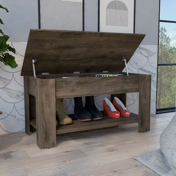 The Tuhome Austin Storage Table is a high quality piece of furniture designed for placing it on your doorway, living room or even in bedroom. This product offers a clean, and modern design with a touch of sophistication. This storage table features a liftable top with metal hinges for better quality and longer life, this storage space measures 37.3 in.W X 20 in.D X 5 in.H, this space can be used for storing hats, umbrellas, jackets, clothes or any kind of stuff. In Addition it features a lower panel that is usually used as a shoe rack that measures 40 in.W X 20 in.D. The Tuhime Austin Storage table is made of particle board in a Dark Brown finish, and measures 40 in.W X 20 in.D X 20.2 in.H