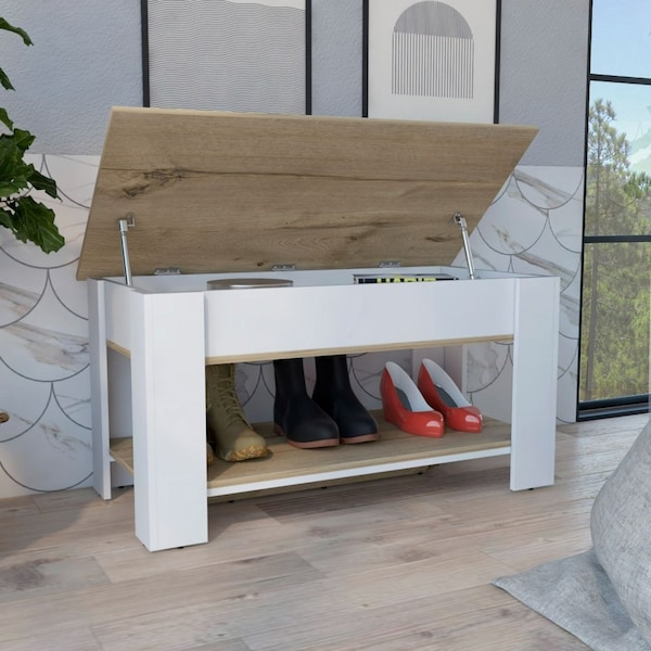 The Tuhome Austin Storage Table is a high quality piece of furniture designed for placing it on your doorway, living room or even in bedroom. This product offers a clean, and modern design with a touch of sophistication. This storage table features a liftable top with metal hinges for better quality and longer life, this storage space measures 37.3 in.W X 20 in.D X 5 in.H, this space can be used for storing hats, umbrellas, jackets, clothes or any kind of stuff. In Addition it features a lower panel that is usually used as a shoe rack that measures 40 in.W X 20 in.D. The Tuhime Austin Storage table is made of particle board in a Light Oak-White finish, and measures 40 in.W X 20 in.D X 20.2 in.H.