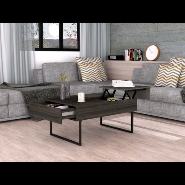 The Beyond Lift-top Coffee Table is a must-have in your home. It is designed to be modern and very functional. The top is the star player in this coffee table, with a spacious design dimensions of 39.3 in. W x 25.2 in. D that will allow you to have plenty of space to display your decor. The finish combination is a unique touch for a modern design. The lift-top feature is fantastic; the mechanism will allow you open and close it softly; it will also open precious concealed storage space for those items you may use frequently but like to have put away.A spacious side drawer is the last touch to display all your decor, books, or magazines without taking any space.Product dimensions are 39.3 in. W x 25.2 in. D x 17.9 in.It is made with manufactured wood in melamine combinations.