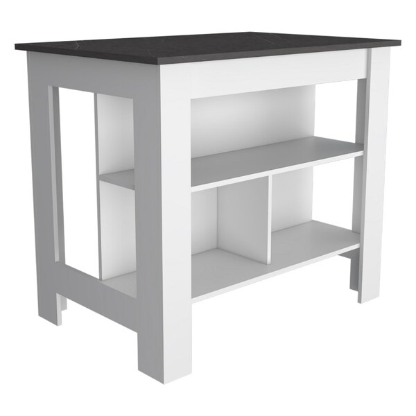 The TuHome Cala Kitchen Island brings style and functionality to your kitchen space. The large tabletop provides an open work area/display shelf. Below the tabletop, you will find one side with two shelves for additional storage space 12 In Height x 12 in Deep x 38 in Lenght. The bottom shelf is split into two equal sections, all of them are perfect for displaying any decor, pots, pans or having kitchen utensils handy when you need them; The other side is designed to be a working station where you can sit with leg room to confortably prep your meals. This two-tone finished piece is sure to draw the attention of your guests. Product Dimensions: 35.4 H x 40.5 W x 27.5 D