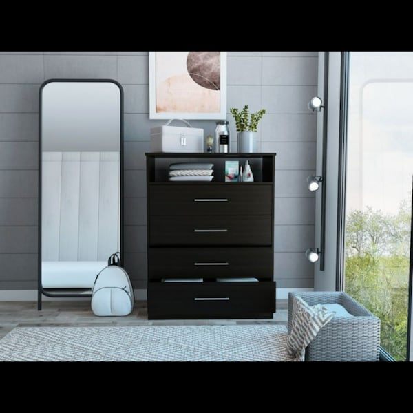 The Tuhome Continental 4 drawer dresser offers a modern timeless look with a beautiful finish and plenty of different storage options available. The top base also works as a TV stand up to 47 in. Flat screen with their proper base. Featuring 4 drawers 7.5H x 29.6 Wx 14.2 D this dresser will cover any storage needs you may have. One additional feature is the top open shelf, is always good when you can have handy your most frequently used items like books, headphones or your cellphone. Standing at 43 in. High and with all metal hardware and handles this is a great addition to your bedroom.