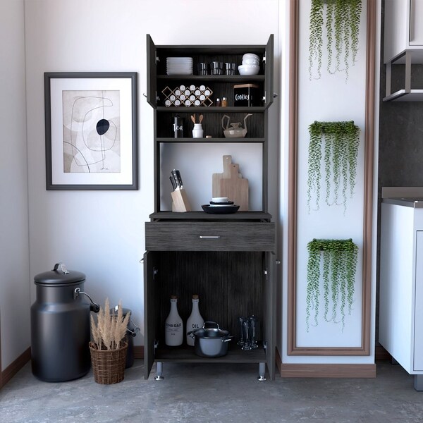 The Tuhome Della Kitchen Pantry is a kitchen organization station that frees up valuable counter and cabinet space, holding your microwave, coffee maker, and other small appliances. This kitchen pantry also features a spacious drawer and hidden storage behind two lower panel doors. The hutch features a top cabinet with two doors and a shelf inside. The counter is 23.6 wide by 13.9 inches deep. Making it ideal for most Microwaves or small apliances. The bottom drawer works great for utencils and the large two door cabinet below is perfect for larger objects. This product has adjutable metal legs to provide stability. Product Dimensions are 66.5 Hx 13.9 W x 23.6 L