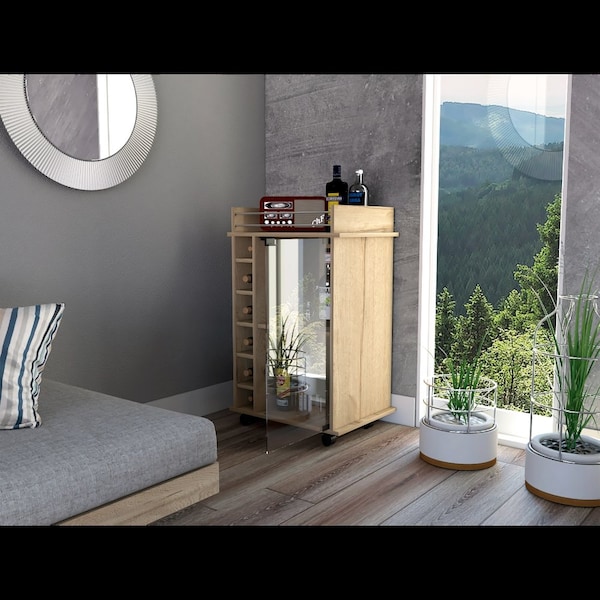 Dukat Bar Cart, Two Shelves, Six Built-in Wine Rack, Four Casters, Light Oak
