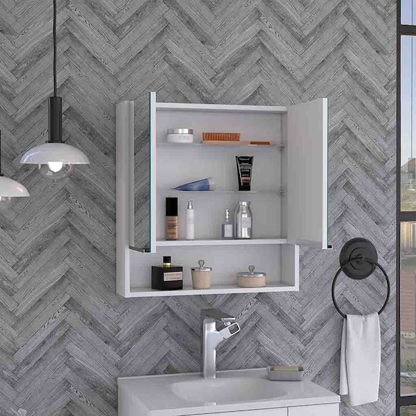 TUHOME brings you the Jaspe bathroom collection; Elegant, modern, very functional, and utterly simple mirror medicine cabinets.Designed with elegant and resistant white manufactured wood finish. Featuring two ample mirror doors with handles for a more practical use allows you to open and close the cabinet doors without leaving fingerprint marks on the mirrors and three interior shelves4,4 in. H X 5,9 in. H X 5,9 in. H X 10,8 in. W. Finally, it features an open shelf 5,7 in. H X 22,4 in. W at the bottom that will provide the option of displaying decorative items to give your bathroom that special touch or just the space to put your daily use items.Product dimensions 23,6 in. W X 5,5 in. D X 24,6 in. H