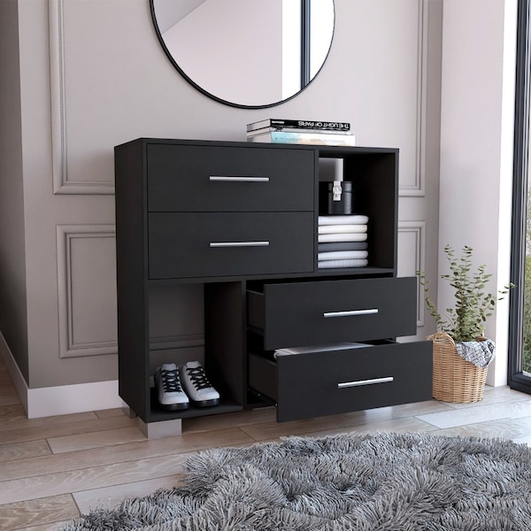 Krista Dresser, Two Open Shelves, Four Drawers, Black