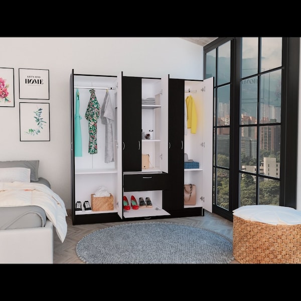 Are you looking to add closet space in your room with a modern, elegant product that has many features you will have it allSay no more; the TUHOME Mitu, a Six-door armoire, is what you need.Three Double Door, very spacious cabinets 42,9 in. H X 20,55 in. W X 18,3 in. , each one with an interior hanging rod, will allow you to hang your shirts, suits, pants, or dresses. Two Interior shelves in each cabinet will give you that extra storage space.The middle cabinet has three interior shelves to keep your folded items, a spacious drawer below, and a pull-down door cabinet are all the extras you want to have all your clothing concealed, neat, and organized.Made of stylish black particleboard, product size 63,78 in. W X 18,62 in. D X 71,26 in. H