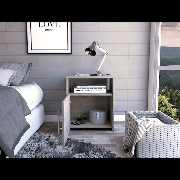 The NORDICO NIGHTSTAND with its simplistic function and modern style, will bring a nice touch to your bedroom. The bottom 14 in.x19 in. cabinet is large enough to hold Thor's Hammer, but probably books or anything else you like to keep bedside. The top shelf space gives you easy access to store and grab anything you might need while getting in or out of bed. The top surface provides an open area to place a lamp or any ornaments that fit your liking.