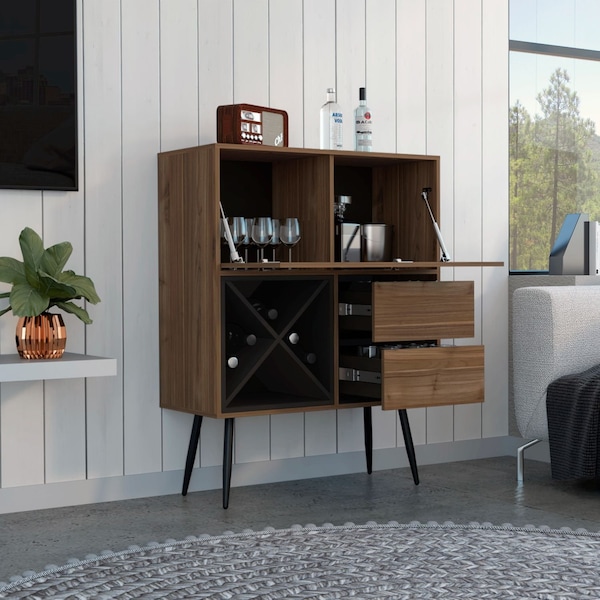 The Tuhome Prunus Bar Cabinet is the most superb complement to your entertainment spirit. It's designed to be a multifunctional, modern piece that will be the highlight of your dining room or living room. Its size makes it perfect for rooms with plenty or limited space available, and a ton of features will provide you everything you need to keep the party going, and your guest entertained.Standing at 45.16 in. High, this bar cabinet will be providing you a place to put your entertainment essentials without taking much space. The top surface 35.4 in. W x 15.7 in. D is great to keep handy your more frequent items, to prepare your drinks or mix your cocktails. Four bottle racks are a great place to store your wine or liquor, and two drawers will provide you the concealed storage space for those items you may need handy but want to keep out of sight. And one cabinet with two interior shelves are perfect for keeping your glasses ready to use at any moment. Product dimensions are 35.4 in. W x 15.7 in. D x 45.6 in. H. It is made in particle board in mahogany-Black finish.
