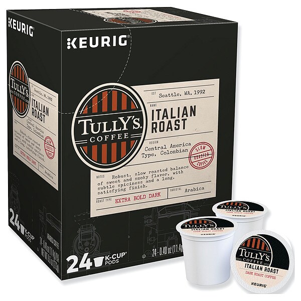 Coffee, Net Weight 2.4 lb, Beverage Package Style Pod, Coffee Roast/Tea Type Dark, Package Weight 0.4 oz, Sub-Brand Tully's Coffee(R), Beverage Flavor Italian Roast, Product Type Coffee, Caffeine Type Caffeinated, Beverage Format Ground, Package Quantity 96