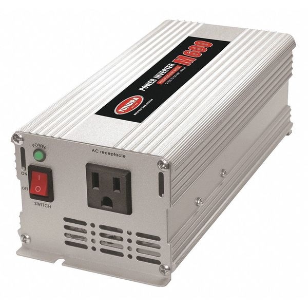 Inverter, Features High Capacity, Ultra-High Output Efficiency and Continuous Output Capacity, Output Form Modified Sine Wave, DC Connection Terminal Blocks, Continuous Output Power 600 W, Peak Output Power 1,200 W, Number of Outlets 1, Input Voltage 12V DC, Output Voltage 120V AC, Output Frequency 60 Hz, Efficiency 93 Percent, Overall Depth 9 3/4 in, Overall Height 3 in, Overall Width 3 7/8 in, Outlet Type (2) NEMA 5-15R, Case Material Aluminum, Application Small Utility Trucks, Fused Yes