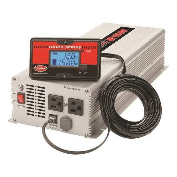 Inverter, Features High Capacity, Ultra-High Output Efficiency and Continuous Output Capacity, Output Form Modified Sine Wave, DC Connection Terminal Blocks, Continuous Output Power 1,500 W, Peak Output Power 3,000 W, Number of Outlets 2, Input Voltage 12V DC, Output Voltage 120V AC, Output Frequency 60 Hz, Efficiency 93 Percent, Overall Depth 15 7/8 in, Overall Height 3 1/2 in, Overall Width 7 1/8 in, Outlet Type (2) NEMA 5-15R, Case Material Aluminum, Includes LCD Remote Control